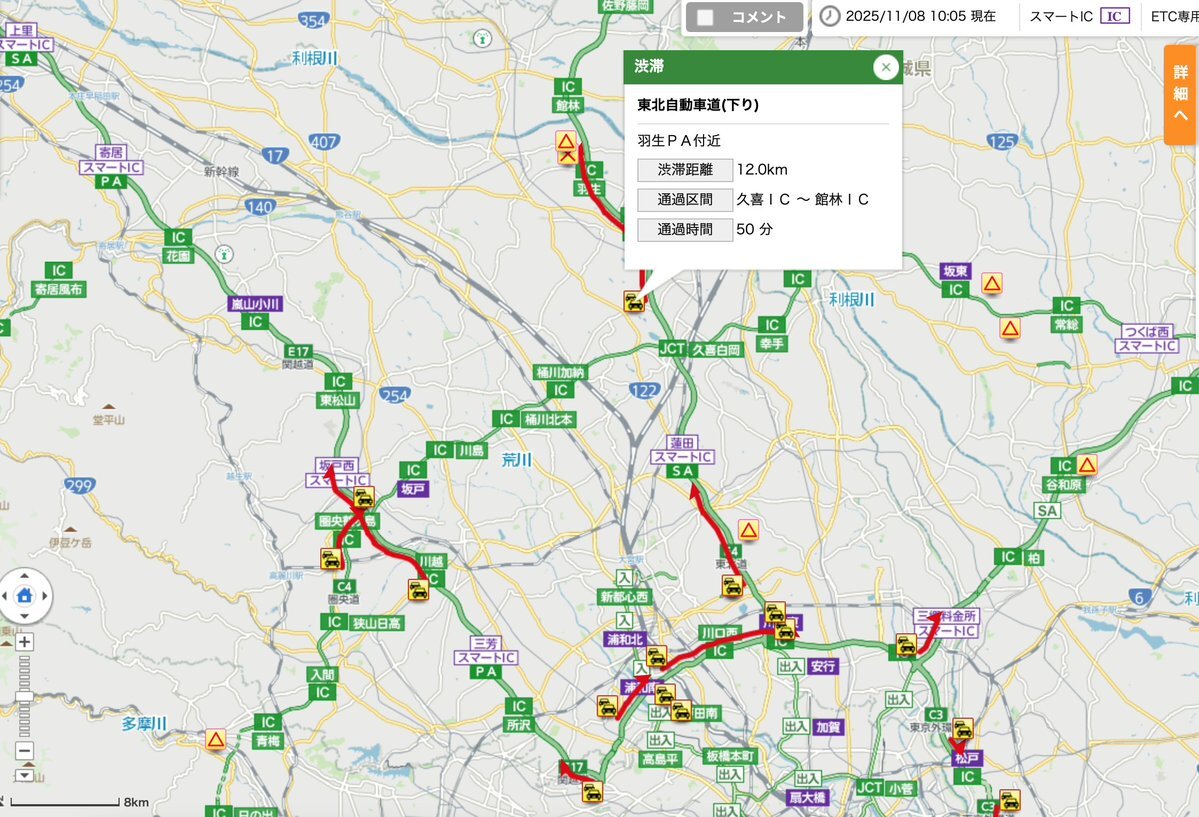 東北道下りは久喜白岡JCT付近での事故のため15kmの渋滞。車線規制は行われていないため比較的流れている様子。関越道下りは鶴ヶ島IC付近を先頭に21kmの渋滞。常磐道下りは友部JCTで11km、柏ICで首都高加平まで伸びて15kmの渋滞です。