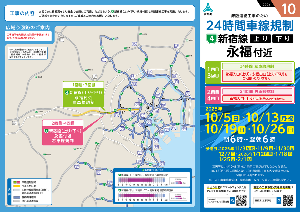 【明日の永福付近工事】 24時間車線規制工事を行います。 お出かけの際は最新の交通情報をご確認ください。 ■ 11/3(月・祝)6時 ~ 11/4(火)6時 ■ 車線規制:4号新宿線(上り・下り)永福付近 右車線 ■ 通行止:(上り)永福入口 詳細はこちら #首都高 shutoko.jp/traffic/contro… pic.x.com/N0kx6aoBF1