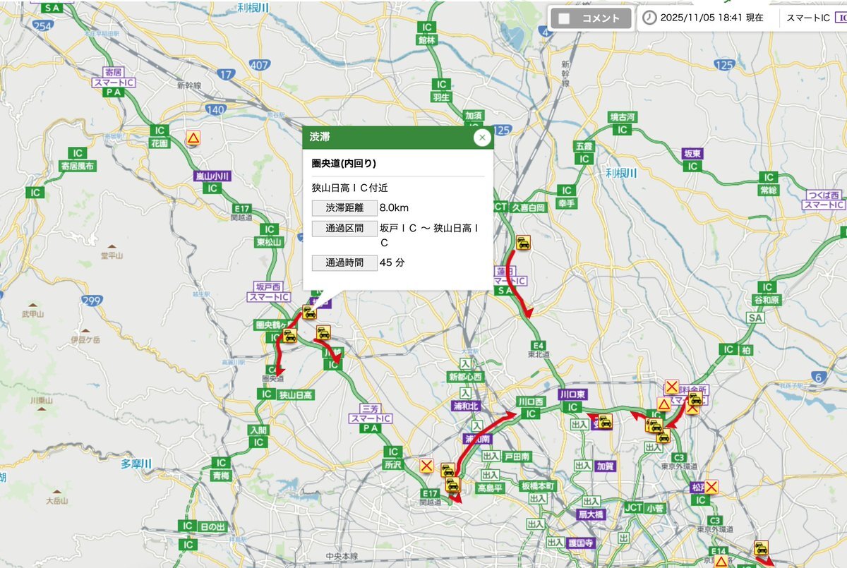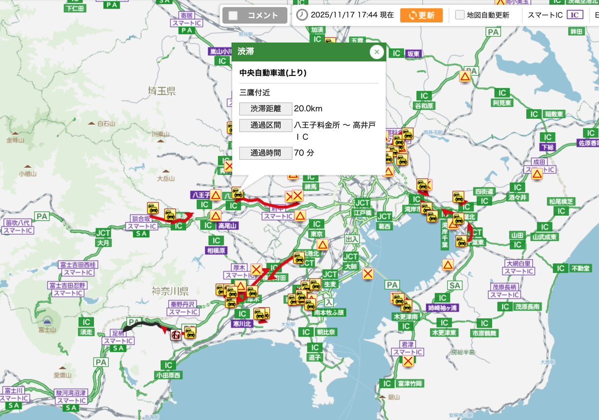 どこも渋滞だらけ。圏央道内回り狭山故障車15k40m 関越道上り高坂事故5k40m 東名上り大和事故全車線規制17k1h 中央道上り三鷹事故17k1h 小仏14k50m #交通情報 #首都圏 #首都高 #事故 #故障車 #渋滞 #東名 #圏央道 #関越道 #中央道 pic.x.com/jlBluKaYvy
