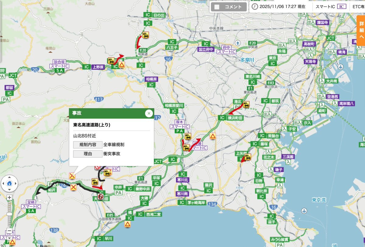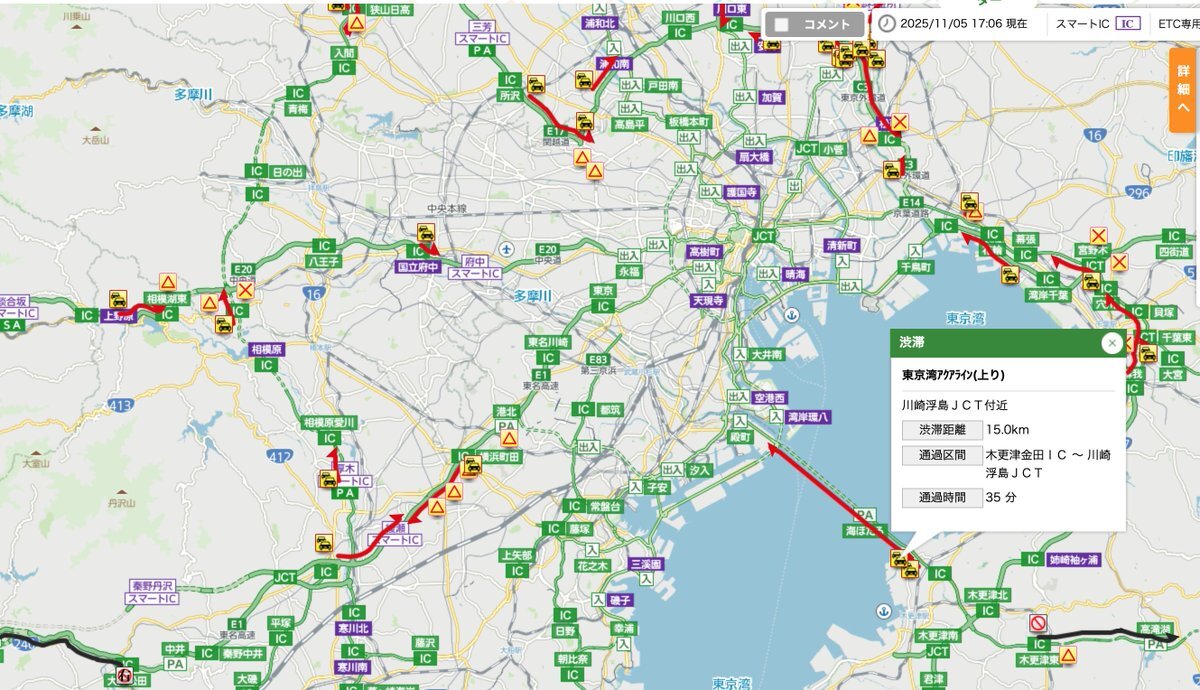 事故渋滞のせいで7時過ぎに着くところ 1時間遅なったよ、事故渋滞だけじゃないよその後に故障者渋滞もしててやっぱりいつ通っても首都高はカスだよ。 それでなくても終日混んどるのに。 需要と供給が合ってなさ過ぎね。