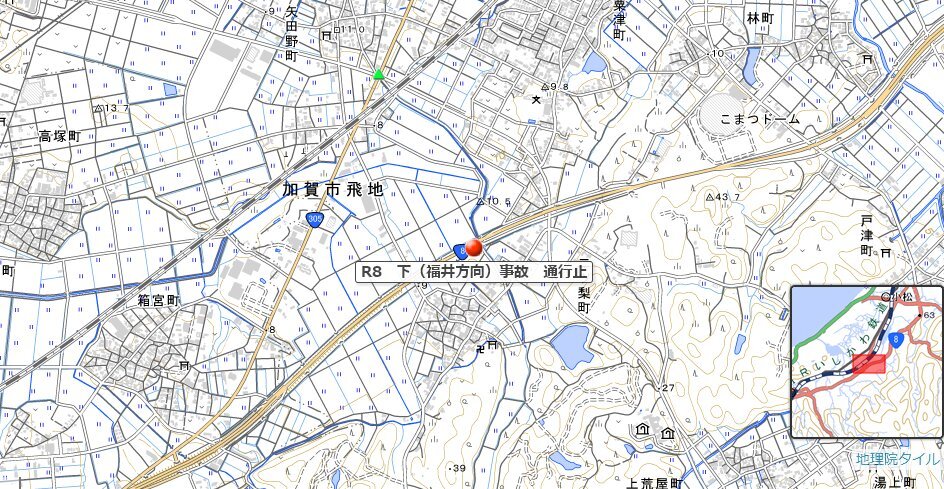 11/8 9:35現在【#国道8号 事故 通行止】 国道8号は、福井方面に向かう下り線の小松市二つ梨インターの先で事故のため、通行止になっています。 pic.x.com/Jq0tuB258m