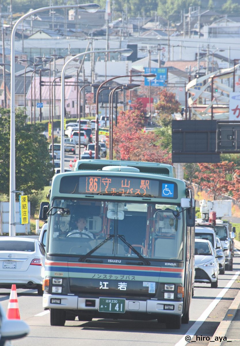 江若交通(江若バス)、琵琶湖大橋を渡る141号車。 琵琶湖大橋を渡る86系統(堅田駅↔️守山駅)141号車、背景の街路樹が秋の様相を呈してきた。 ところで今日は橋の耐震工事で南側西向き2車線が通行止め、北側東向き2車線が対面通行に。メロディロードの琵琶湖周航の歌🎶は逆再生?… 📷10/29 #江若交通 pic.x.com/e5OT5oLECA