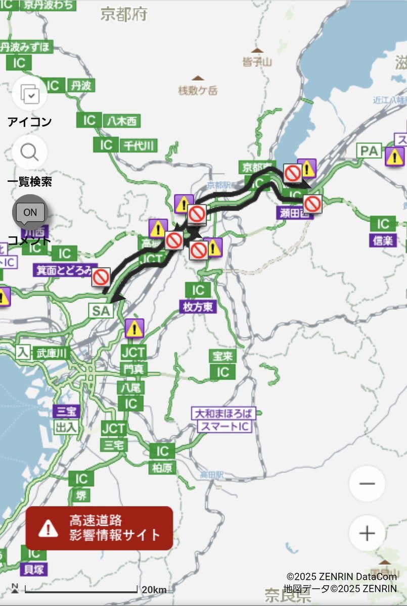 通行止【11月12日20:05現在】京都縦貫道 大山崎JCT・IC〜長岡京IC (下り北行) 工事による通行止です。通行止作業情報はiHighway.jp/t.fcgi?k=6詳しくはiHighway.jp/r.fcgi?k=map_06
