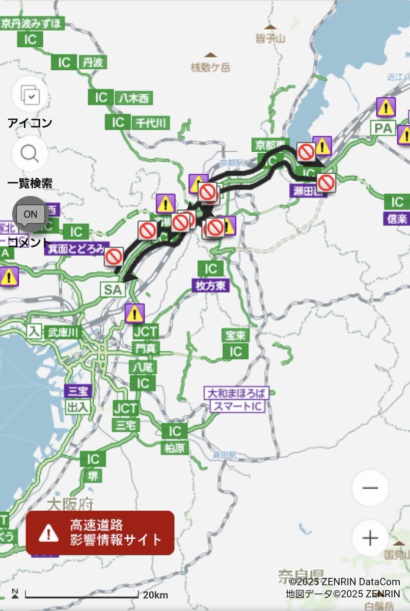 通行止【11月12日20:05現在】京都縦貫道 長岡京IC〜大山崎JCT・IC (上り南行) 工事による通行止です。通行止作業情報はiHighway.jp/t.fcgi?k=6詳しくはiHighway.jp/r.fcgi?k=map_06