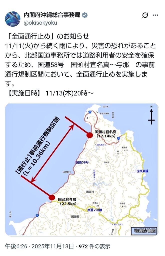 国道58号 国頭村宜名真〜与那 全面通行止めらしいよ x.com/okisokyoku/sta…