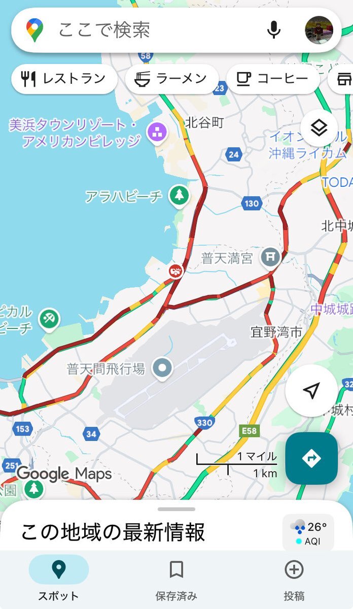 情報が欲しい、何が起きてる?? 23番や31番など普天間を通るバスが軒並み90分以上遅れてるけど… 58号線も北谷から城間まで混んでる……😱 (事故マークはちょくちょく見えるけど、これだけが原因とも思えない……) pic.x.com/GiLnU06Mru