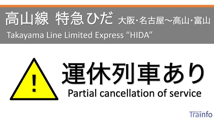 【特急ひだ 上下線 一部運休】 東海道線・高山線の特急は、10月1日16:40頃、高山線内での踏切事故による車両不足の影響で、以下の列車が全区間で運休となっています。 ひだ83号 高山行 ひだ84号 名古屋行 pic.x.com/fFsPtZ6lwJ
