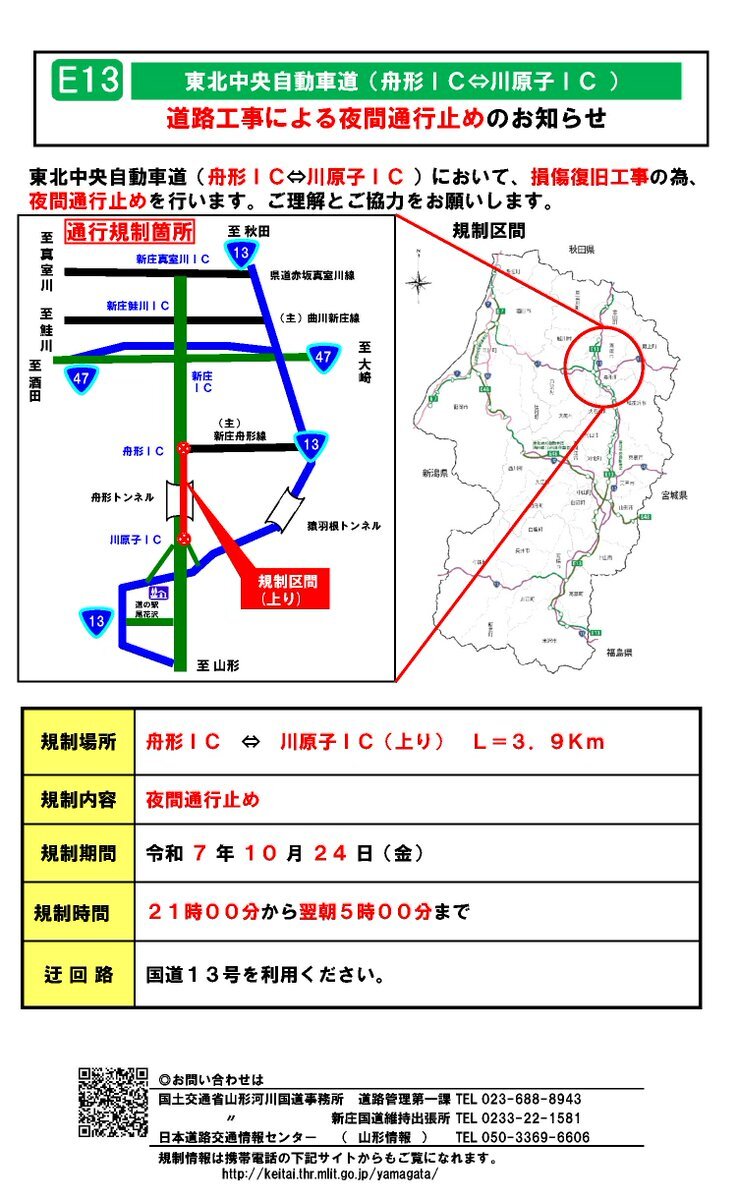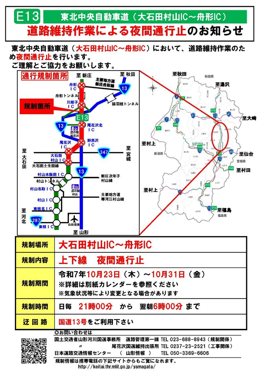 【道路交通規制情報】 ■規制場所 東北中央自動車道 大石田村山IC~舟形IC 上下線 夜間通行止 ※迂回路は国道13号をご利用下さい ■規制期間 令和7年10月23日(木)~10月31日(金) 日毎21:00~翌朝6:00 #規制 #E13 #東北中央自動車道 #山形県 #夜間通行止 pic.x.com/BGxnpLArfj