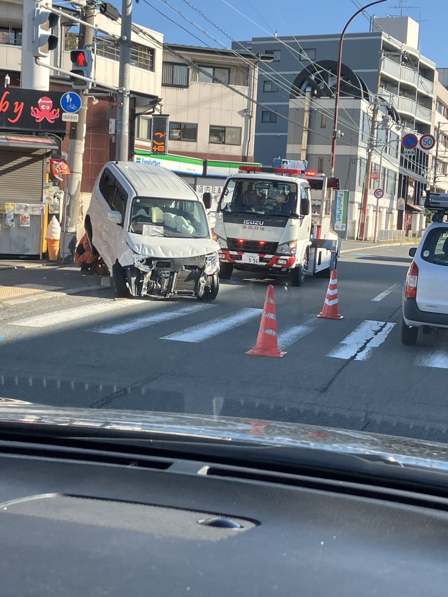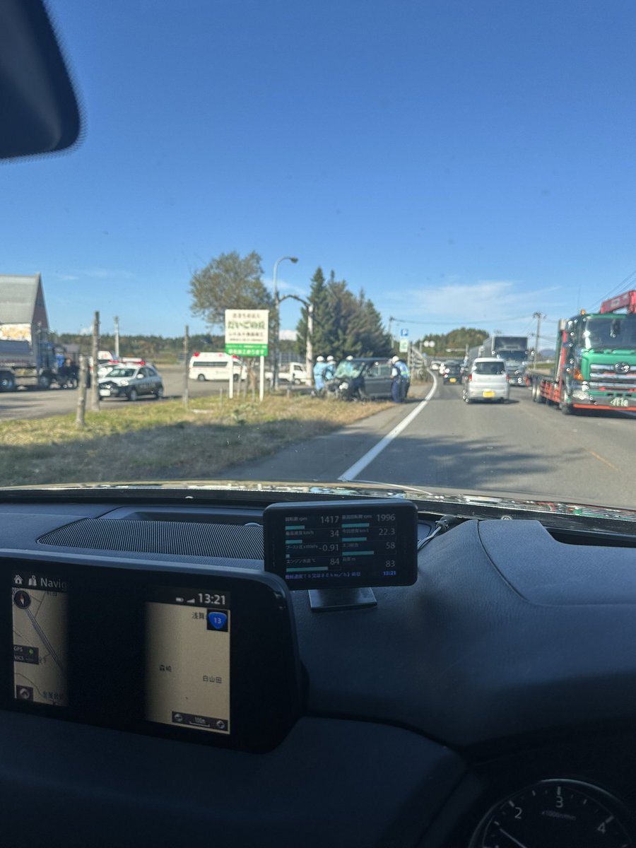 国道13号線の東根市蟹沢歩道橋付近で乗用車とトラックの事故(上り車線) 警察到着済みで片側車線潰れており、若干渋滞発生してきてます。 #山形 #交通事故 #東根市