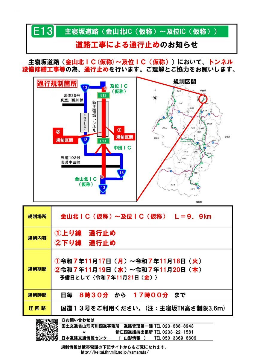 ■規制場所 #主寝坂道路 #通行止 金山北IC(仮称)~及位IC(仮称) ■規制① R7年11月17日(月)~11月18日(火)日毎8:30~17:00 上り線 通行止 ■規制② R7年11月19日(水)~11月20日(木)日毎8:30~17:00 下り線 通行止 ※迂回路は国道13号 (注:主寝坂TN高さ制限3.6m) pic.x.com/hp2C6ax6tQ
