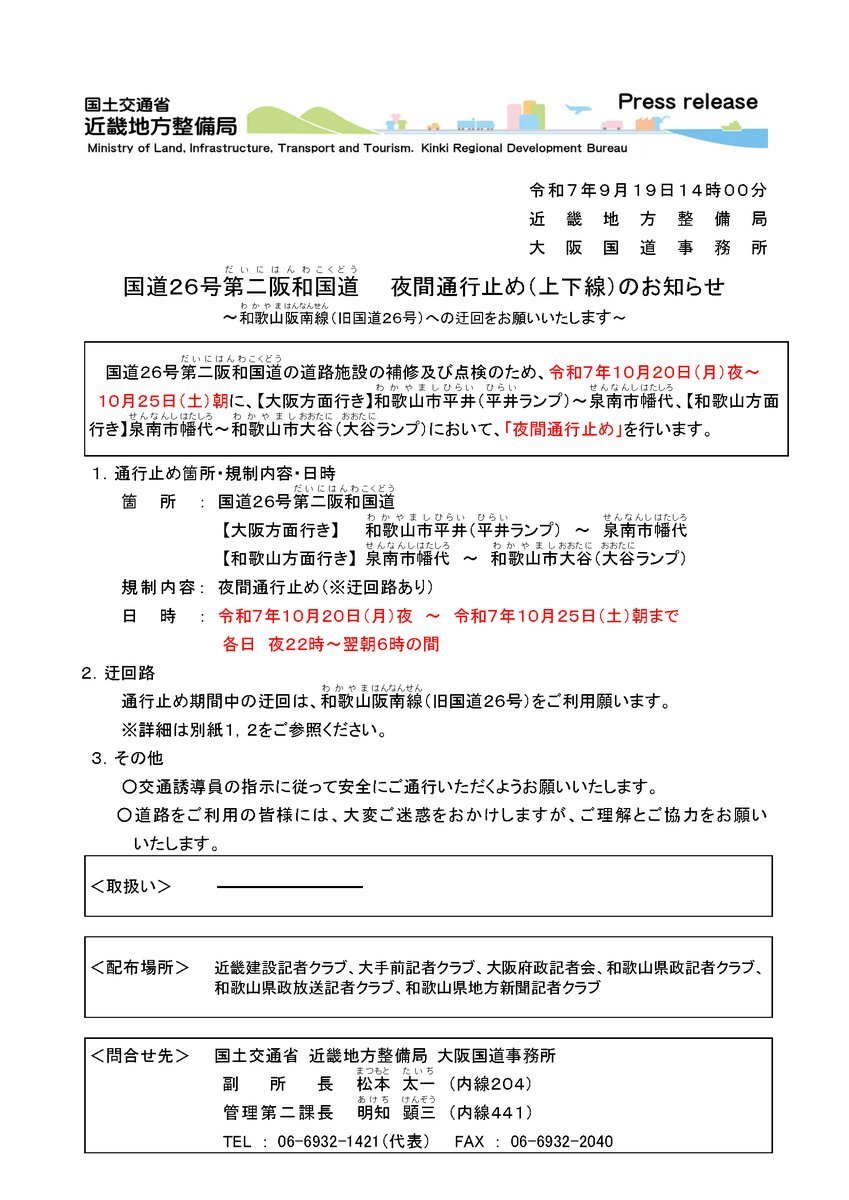 📢第二阪和国道 夜間通行止めのお知らせ #国道26号 #第二阪和国道 (大阪方面)和歌山市平井~#泉南市 幡代 (#和歌山 方面)泉南市幡代~和歌山市大谷 規制内容:#夜間通行止め 迂回路:和歌山阪南線(旧国道26号)をご利用願います。 詳細はこちら🔎 kkr.mlit.go.jp/osaka/press/20… pic.x.com/AzXzUeSg1f