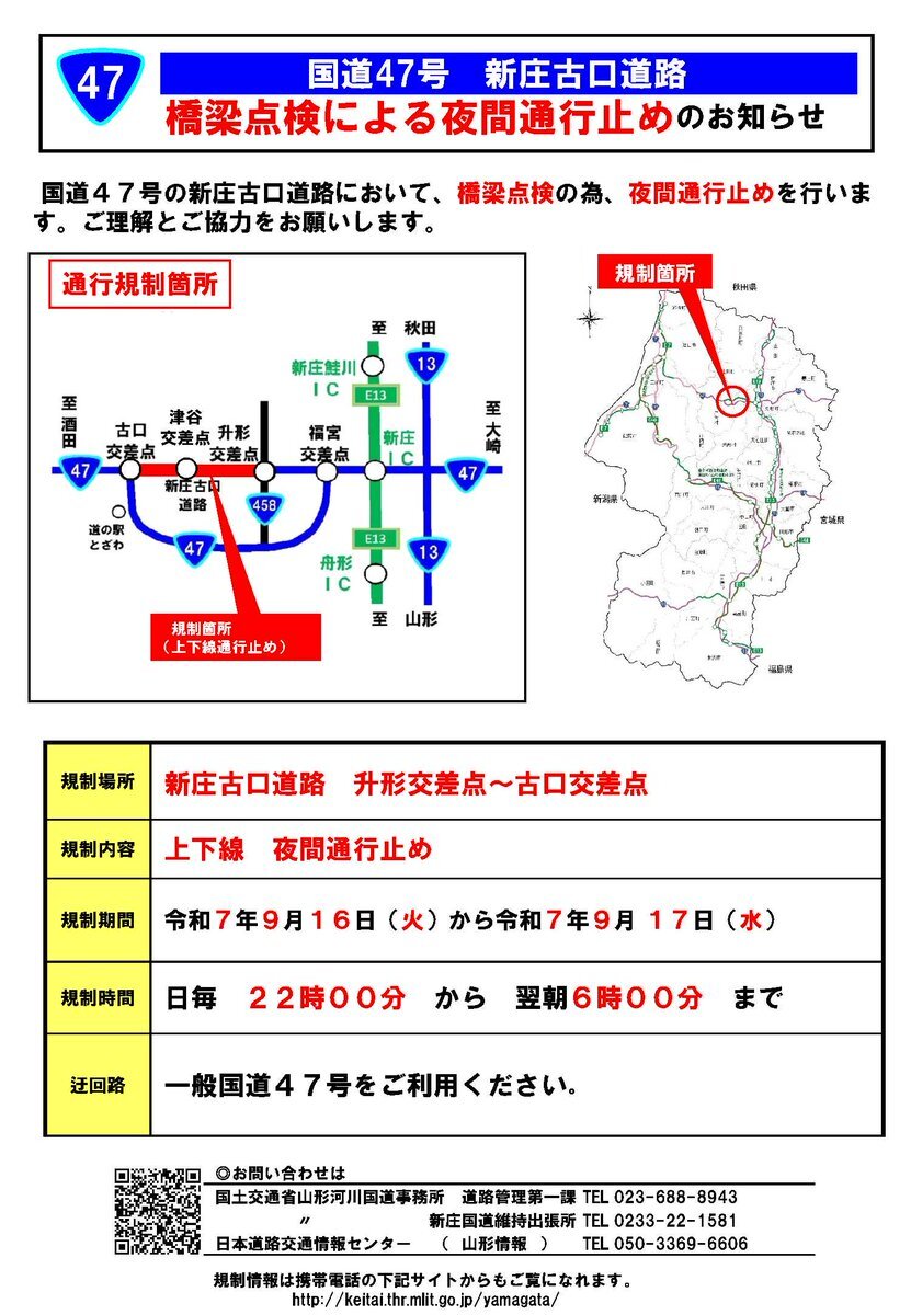 【道路交通規制情報】 ■規制場所 新庄古口道路 升形交差点~古口交差点 上下線 夜間通行止め ※迂回路は国道47号 ■規制期間 令和7年9月16日(火)~9月17日(水) 日毎22:00~翌朝6:00 #規制 #国道47号 #新庄古口道路 #山形県 pic.x.com/xwunrZLTKS