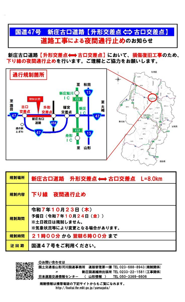 【道路交通規制情報】 ■規制場所 新庄古口道路 升形交差点~古口交差点 下り線 夜間通行止め ※迂回路国道47号をご利用ください ■規制期間 令和7年10月23日(木) 21:00~翌朝6:00 #規制 #国道47号 #新庄古口道路 #山形県 pic.x.com/6jbC25dUM0