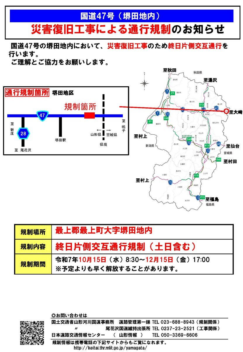 【道路交通規制情報】 ■規制場所 国道47号 最上町 堺田地内 終日片側交互通行規制(土日含む) ■規制期間 令和7年10月15日(水)8:30~12月15日(金)17:00 ※予定よりも早く解放することがあります #規制 #国道47号 #最上町 pic.x.com/dR6Tnyx7XS