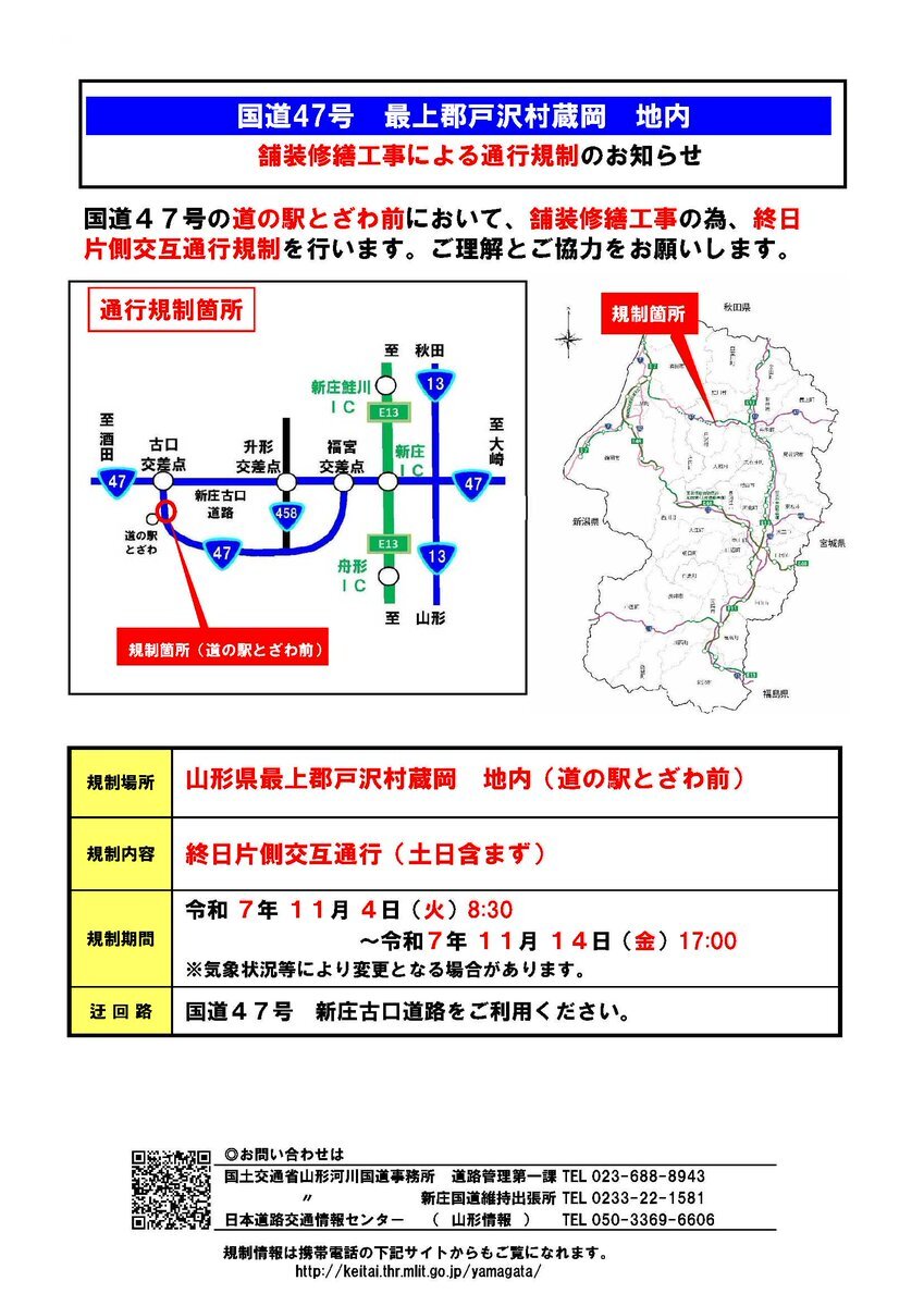【道路交通規制情報】 ■規制場所 戸沢村蔵岡地内(道の駅とざわ前) 終日片側交互通行規制(土日含まず) 迂回路は新庄古口道路 ■規制期間 令和7年11月4日(火)8:30~11月14日(金)17:00 #規制 #国道47号 #戸沢村 #山形県 pic.x.com/iHwIbs6EEs
