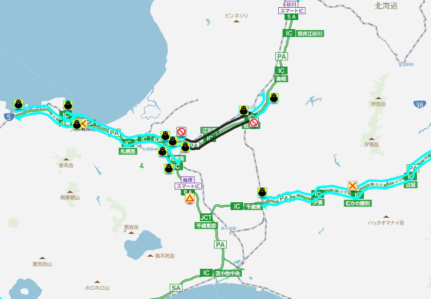 【開始】事故通行止・IC入口閉鎖(7:57現在) 〇E5道央自動車道 美唄IC⇒滝川IC(旭川方面) 砂川SAスマートIC(両方向の入口) ▼お出かけの際は最新の道路情報をご確認ください。 drivetraffic.jp/realtime-area?…