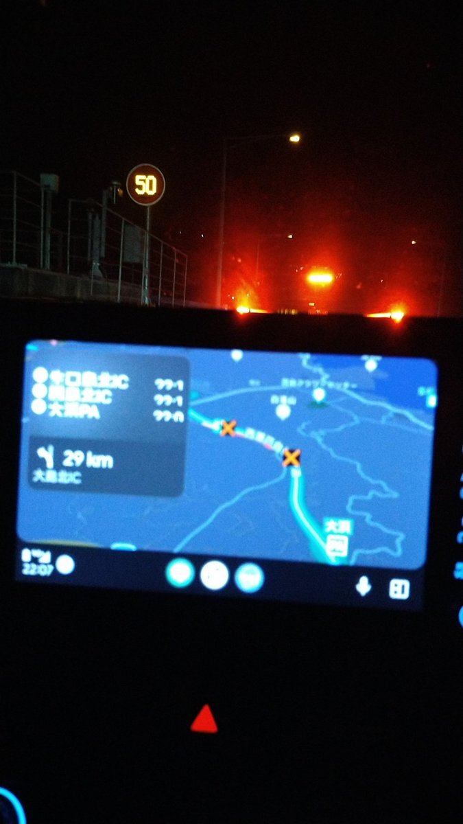 しまなみ海道下り線、因島大浜PAから数百mの地点で単独事故が発生しています。 上り線にも大小多数のパーツが道路に散乱していますので走行される方は御注意を。 #しまなみ海道 #事故