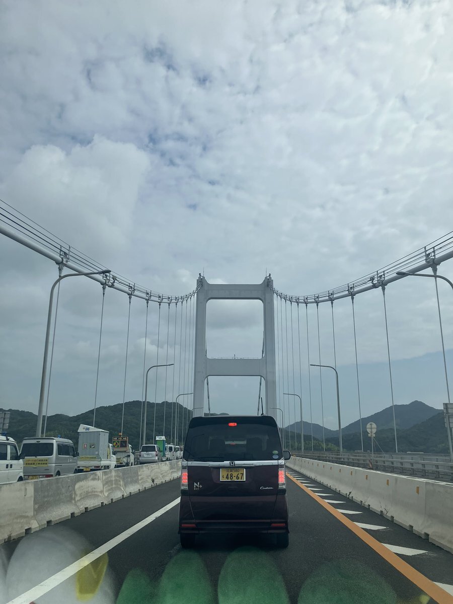 しまなみ海道。一部で車線規制で片側通行のところがあった。 そのため片側が止まるところがあるのだが、止まったところが橋の上だから向こうから来る車が通るたびに揺れる上に5分その状態だからちょっと怖かった(笑)