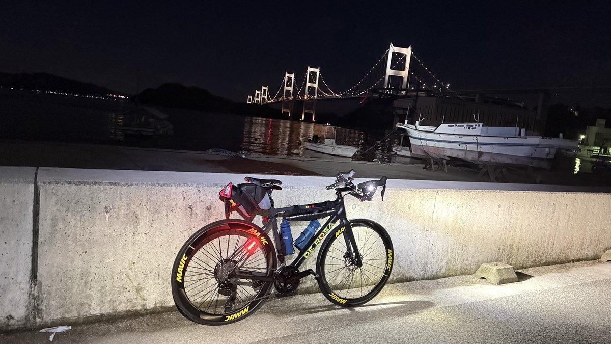 #サイクリング #しまなみ海道 #さざなみ海道 実は事故後、こんな遅くまで走ったことはなかったかな?🤔 明る内に切り上げる距離で #DEROSA で初ナイトライド? 少し暗くなる程度はあったけど🤔 pic.x.com/I4u3LA6JoZ