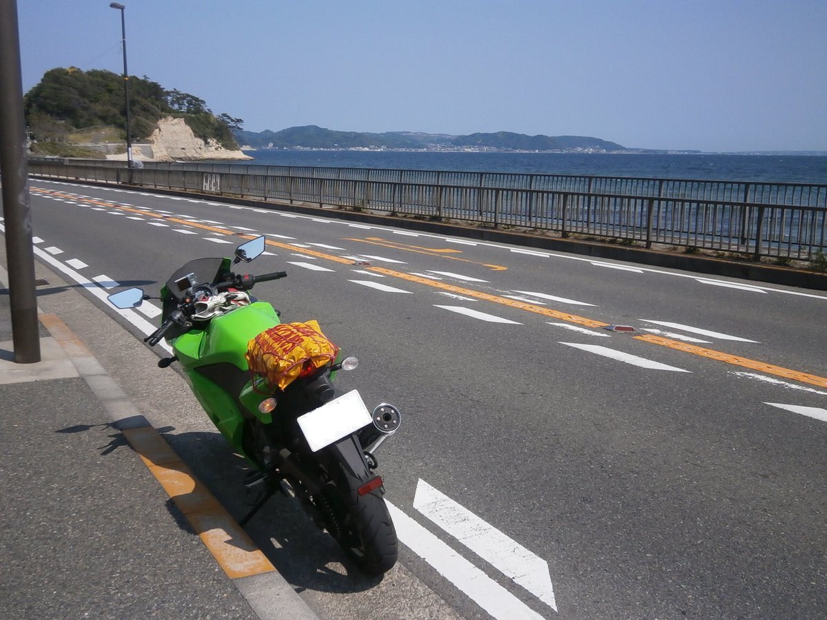 鎌倉の七里ヶ浜から稲村ヶ崎をのぞむ 平日でも慢性的に渋滞する国道134号でこのすきよう 愛車Ninja250Rのライムグリーンと空と海の青 pic.x.com/Ih7m71qaGh