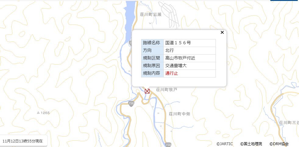11/12 14:38現在【国道156号 北行き 通行止解除】 国道156号線の富山県方面に向かう北行きは、高山市荘川町牧戸で続いていた、渋滞の影響による通行止めが解除されました。 ただ、高速道路の東海北陸道は、上下線の飛騨清見IC~白川郷ICの間が故障車のため引き続き通行止めです。 x.com/jartic_gifu/st…