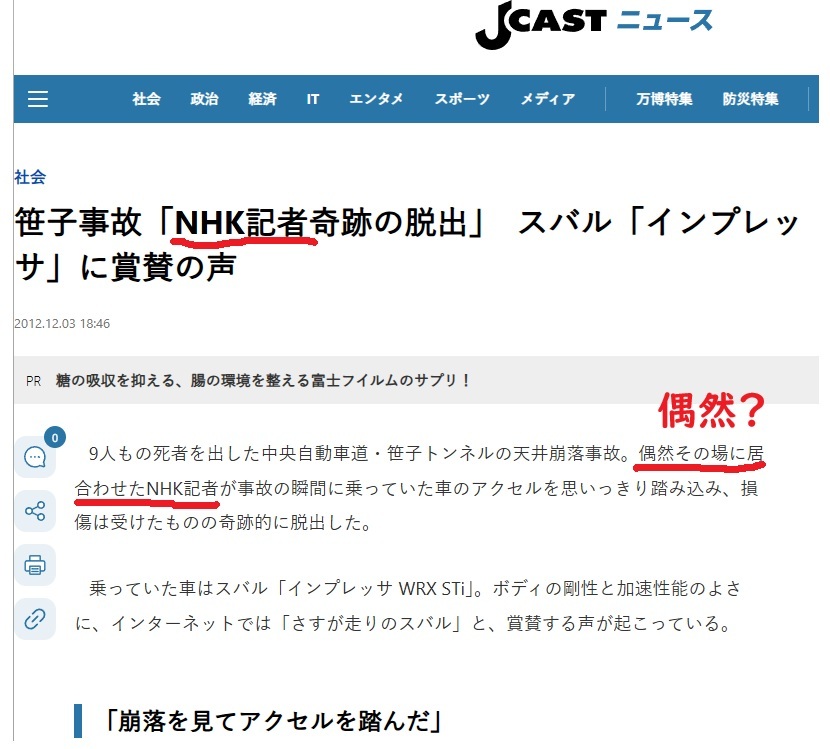 @anticorona9QAJF笹子トンネル崩落事故のとき たった一台だけ脱出した車いたよね 奇跡の脱出って言われたスバル車 NHK記者なんだよね ホントに偶然だったのかしら? #笹子トンネル崩落事故 #NHK pic.x.com/TcL2sCnREc