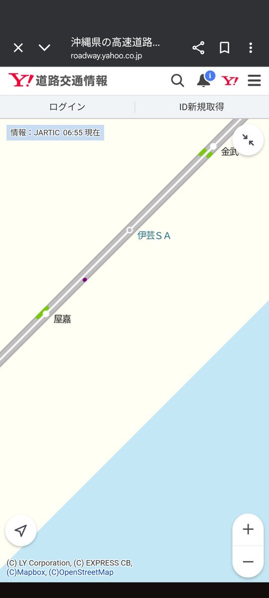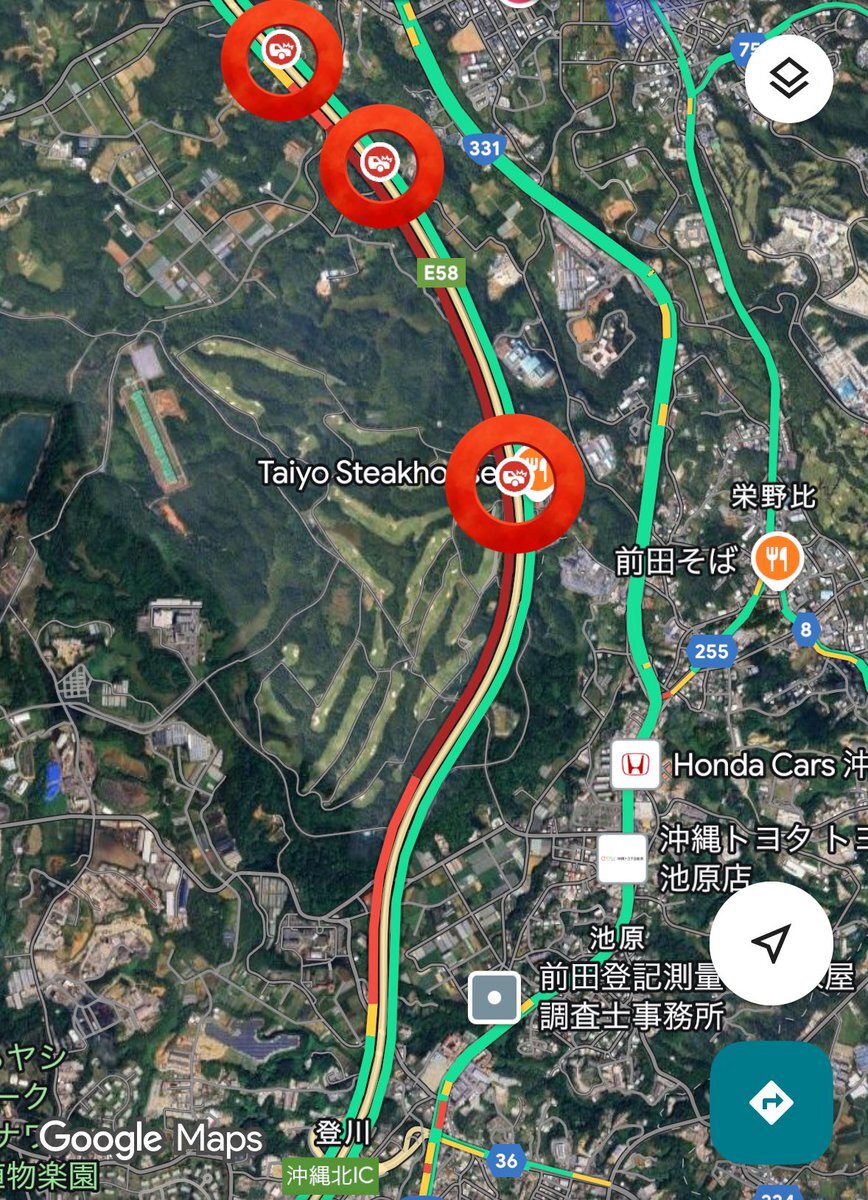 沖縄自動車道、金武~屋嘉間で事故発生、と329号線沿いの電光掲示板に表示されてました(6:55現在)。 事故発生は那覇行き路線。伊芸SAと屋嘉の間。下記画像の紫の点が事故発生場所。 #沖縄自動車道 #事故 pic.x.com/TvNjNMZunh