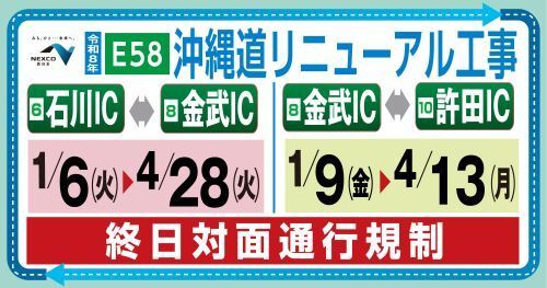 令和8年1月6日(火)から石川IC~金武ICで、1月9日(金)から金武IC~許田ICで、終日対面通行規制を行います。 沖縄道リニューアル工事のお知らせ|那覇空港旅客ターミナルビル naha-airport.co.jp/news/19144/ pic.x.com/DAHMIVwyre