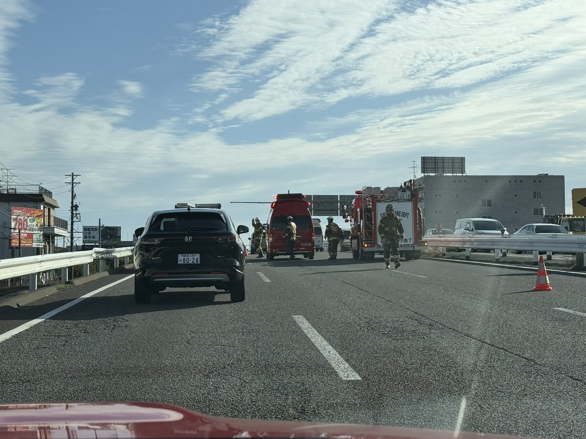 国道21号東向き各務原方面 茜部本郷交差点通過直後3→2車線絞り込み付近で事故右車線規制中 オイル漏れの恐れがあるため消防も出動作業中 #事故 #国道21号 pic.x.com/R2VwHriSgy