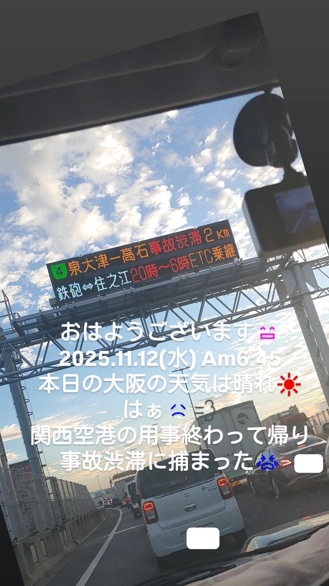 🚗 おはようございます😄 今日の大阪の天気は晴れ⛅ 気持ち良い朝です😄 関西国際空港での用事もやっと終わって帰ってます。 阪神高速で事故渋滞に捕まった😭 徹夜で眠いのに渋滞はキツイなぁ~😭 #イマソラ #大阪 #阪神高速 #事故渋滞 #r71112 pic.x.com/mEMVoEEwB7