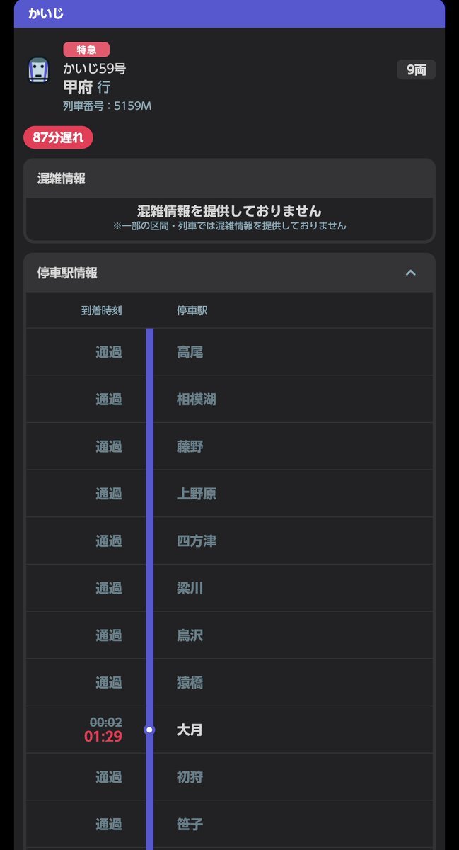 甲府行き最終の“かいじ”も、甲府着は2時を過ぎる見込みですし… (特急券払い戻しの2時間遅延には届かなさそうですけど) …中央線方面、高尾までの中央線快速電車の範囲を超えて、中央本線(中央東線)まで影響が出てて…大変ですね、とは pic.x.com/W9pnKNDf3k x.com/irodori_season…