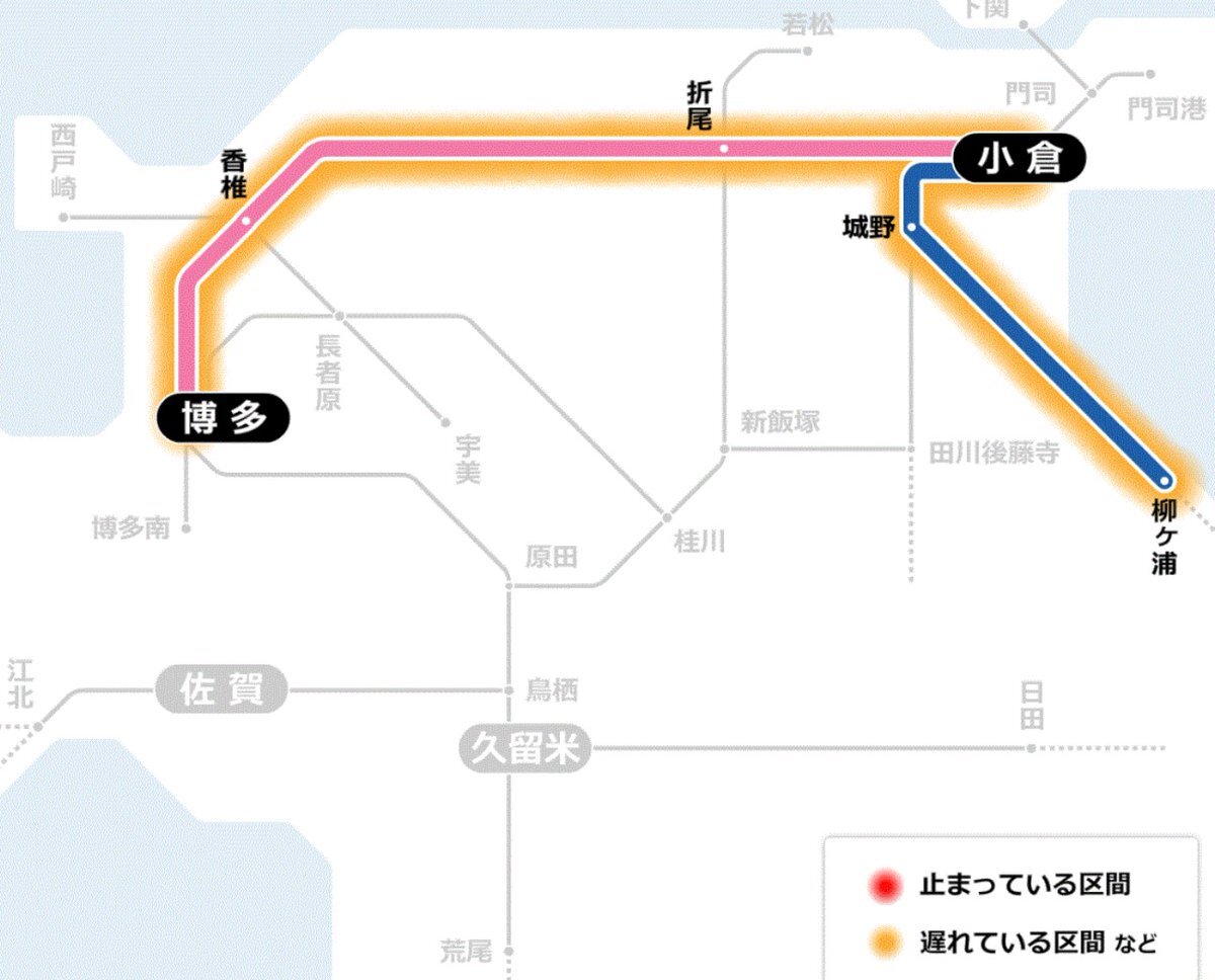 鹿児島本線運転見合わせ区間アリ他 特急運休アリ 最新情報確認を 2025年10月12日21時2分更新 線路故障 発生 19時20分 場所 鹿児島本線西小倉~スペースワールド 鹿児島本線運転見合わせ小倉~折尾 遅延門司港~小倉、折尾~羽犬塚 日豊本線遅延小倉~大分 下りは終日運転を見合わせ 上り小倉方面は運転 x.com/jrkyushufukhok…