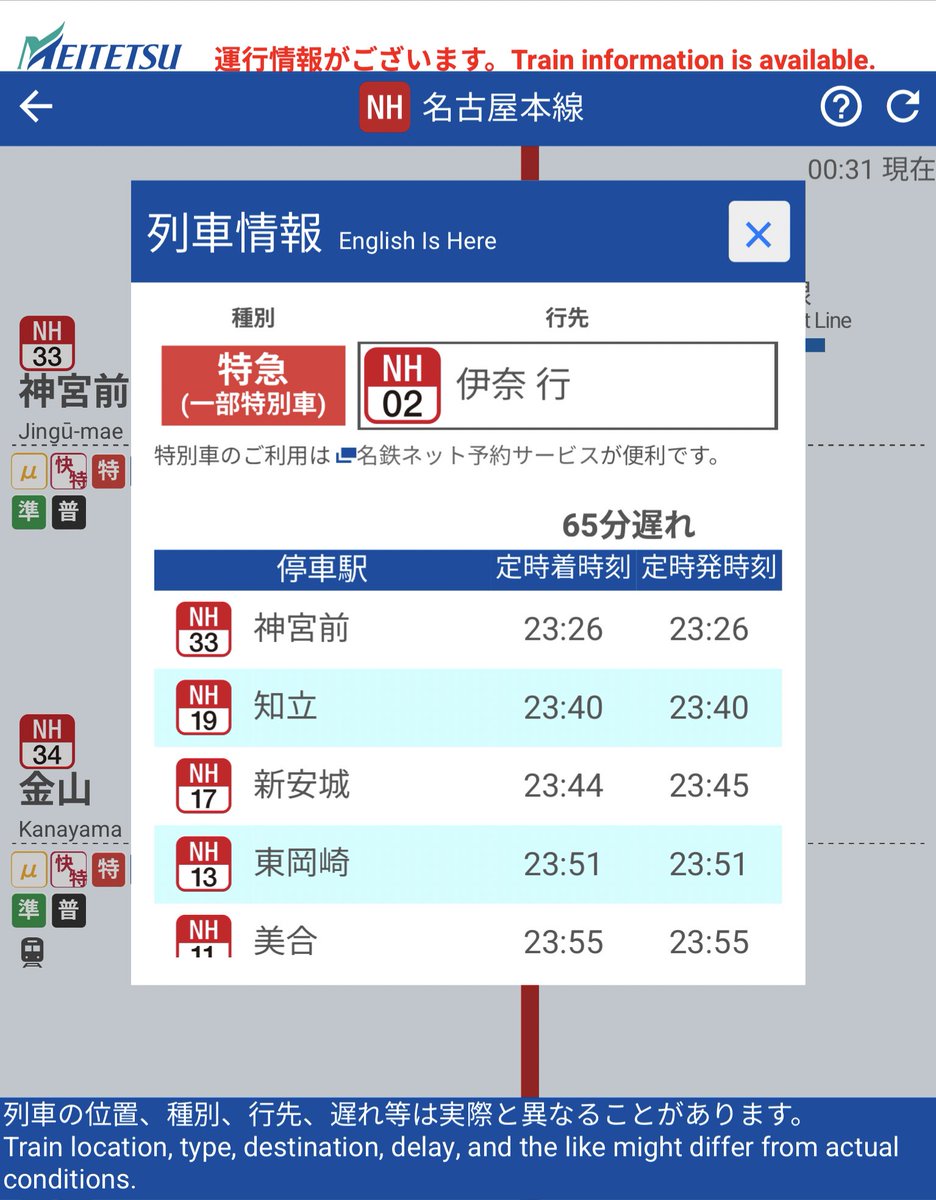 遅延・一部運休 路線 名古屋本線 西尾線 常滑線 空港線 河和線 津島線 尾西線 犬山線top.meitetsu.co.jp/em/ryokaku/for… 理由 名古屋本線 金山駅構内 ポイントの故障 備考 点検作業を実施しましたが、ポイント故障の復旧には相当時分かかる見込みです。