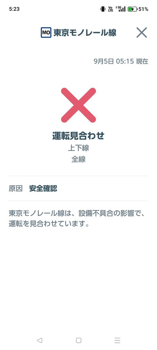 【2025年09月05日 5時42分】東京モノレール線は、設備不具合の影響で、運転を見合わせていましたが、5時30分頃に運転を再開し遅れがでています。 tokyo-monorail.co.jp/guidance/
