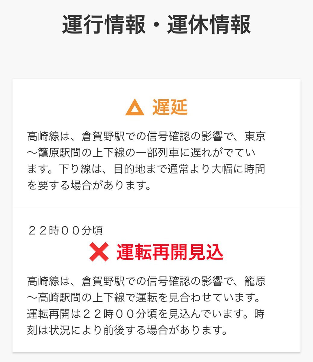 高崎から東京に帰宅するときはJREポイントをグリーン券に交換して高崎線のグリーン車に乗ることが多いんだけど、倉賀野の信号機故障とかで運転見合わせ (´・ω・`;) ライブ終わりの人も多くて改札前が混雑。 仕方ないから新幹線で帰ってきた。高崎〜東京で5千円は痛い。でも帰れないのは困る pic.x.com/xeKvodGhLQ